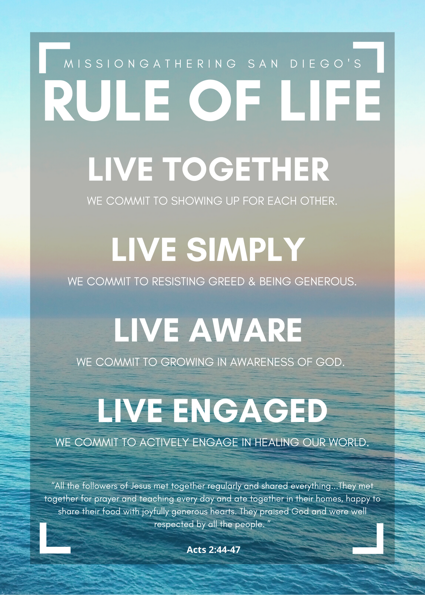 For Missiongathering San Diego, a commitment to the Rule of Life is what grants one official “membership” in our community. Therefore, we invite you into prayerful consideration prior to officially committing to join us on the journey of faith.
